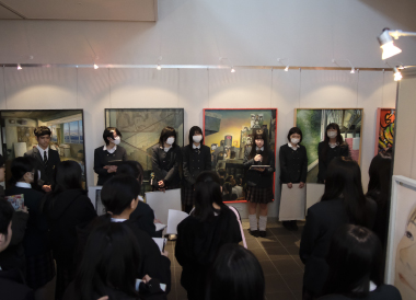 初日となったこの日、昼休みの時間帯を使って3年制作者全員によるギャラリートークが行われ、作品解説をしながら関わりのあった先生方や1、2年生と和やかな時間を過ごしました。その後すぐに、特別講師の西房浩二先生が訪れ、3年生にとって高校最後の講評会が行われました。
