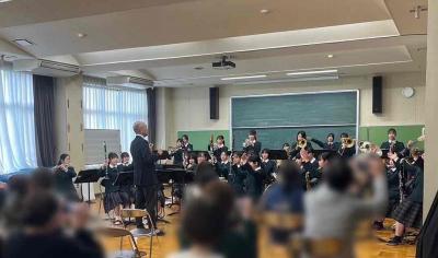 「アニメ・メドレー 久石譲作品集」をはじめとした5曲の演奏と楽器紹介を行い、子供たちや来賓の方、保護者の方に聴いて頂きました。