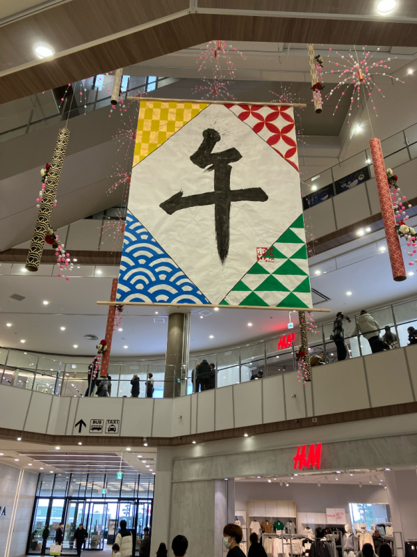 新春をテーマに力いっぱい書き上げましたので、イオンモール新小松さまへ足をお運びの方は見上げていただけると嬉しいです。展示期間は12/27~1/6 場所は1F華広場となります。