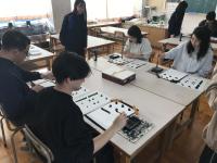 1月10日(土)国際交流として海外にルーツを持たれる方々が来校されて、書道体験を行いました。中には筆を持つことが初めての方もいらっしゃったのですが、書道部員のアドバイスや手本を受けて真剣に取り組まれていました。全体的に和やかな雰囲気で会は進み、最後には色紙や皿に自分が選んだ漢字を書き、持って帰っていただきました。書道部員も楽しく対応でき、良い会になったと思います