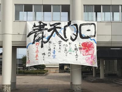 今年は市高祭のスローガン「晴天白日」をテーマに、市高祭開会式でオープニングアクトのような感じで実施しました。初めて体育館・全校生徒の前で行うパフォーマンスで、今までで一番楽しい時間でした。私は「天」の字担当で、パフォーマンスの一番最後に書く字だったので、ダイナミックに書きました。市高祭の良いスタートを切れて良かったです。ありがとうございました。