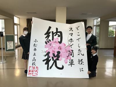 毎年この時期に「税を考える週間」として小松税務署からの依頼を受け、作品を制作しています。今年度は全員で案を出し合い、作りました。絵のデザインは、お金にちなんで、100円硬貨の桜をモチーフに考えました。スマホで簡単に納税ができることを知って欲しいという思いを込めました‼︎