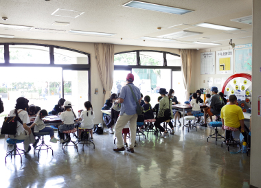 今年度の1年生にとっては2、3年生と関わる初の機会となりました。それぞれが描いた名刺ほどの大きさの自己紹介カードをかざしながら、互いに自己紹介をしました。