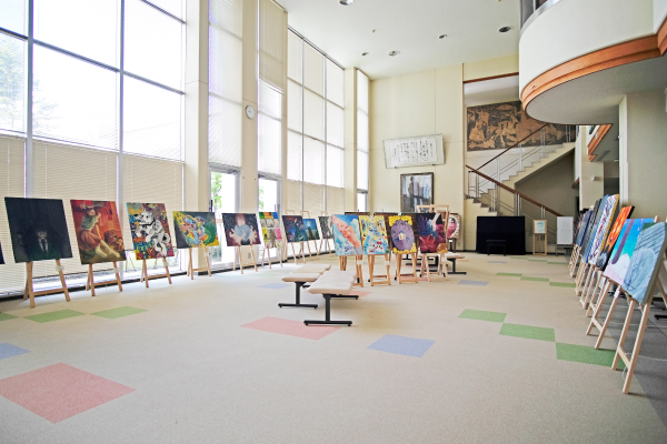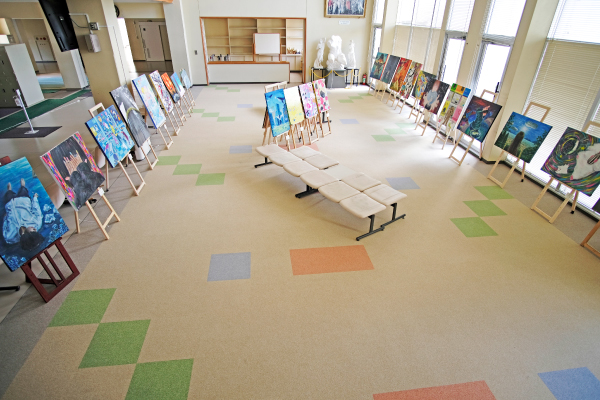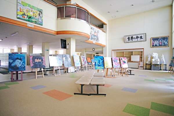 県総文が終わりました。金沢21世紀美術館で展示されていた作品たちが学校へ帰って来て、このまま倉庫行きも寂しいので、美術館に来れなかった人にも見てもらおうとエントランスギャラリーを開催しています。難しいことは考えず、「これ、何か好き」「この絵カワイイ」「この作者に未来を感じる」など気楽な気持ちで、多くの人にゆっくり見てもらいたいです。