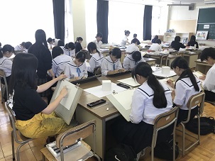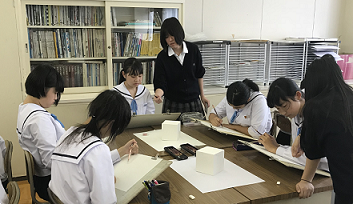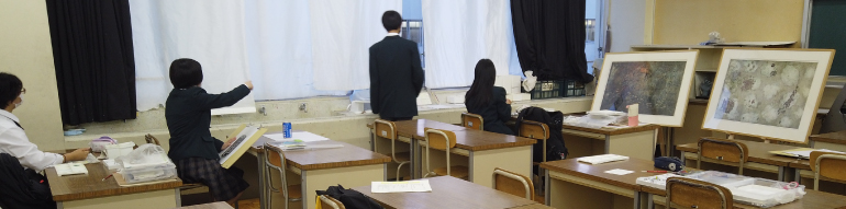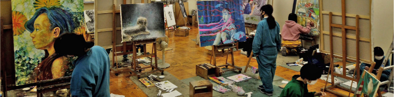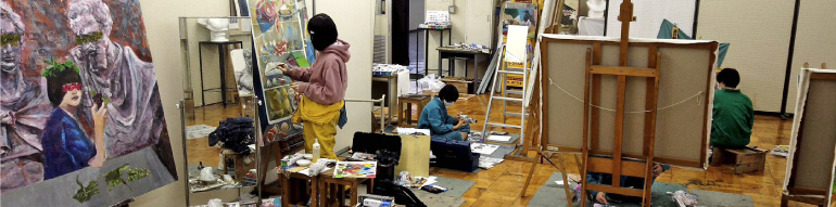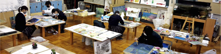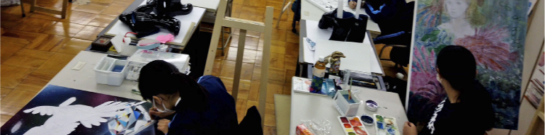 部長より:美術部は、芸術コース美術専攻生が全員所属しています。2年生から油絵、日本画、デザインの3つの専科に分かれ、それぞれ作品制作やデッサンを通して技術や知識を身につけていきます。また、加賀地区展や総文などのコンクールに向けての制作もしています。