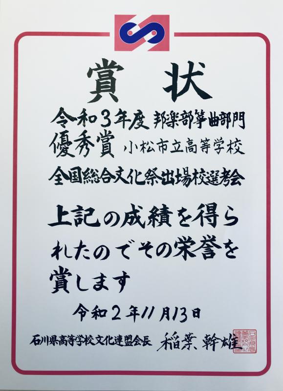 11月12日(金)金沢歌劇座で開催された、邦楽新人演奏会にて本校は菊重精峰作曲の「魁」を演奏し、優良賞をいただきました。