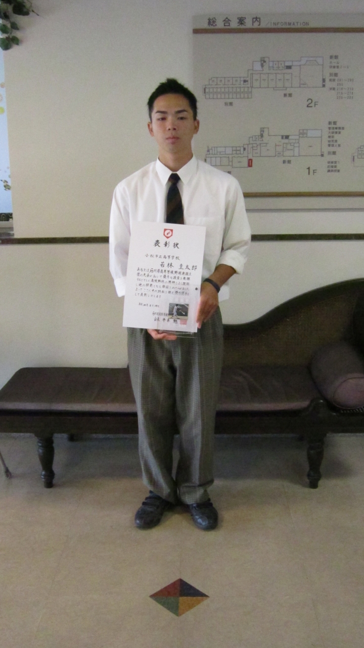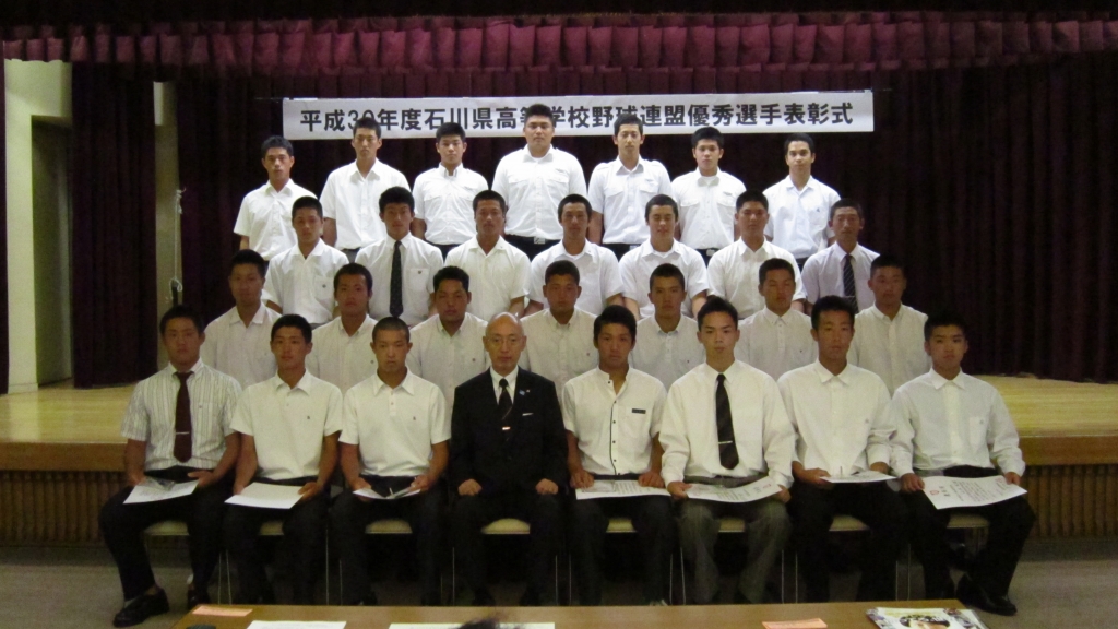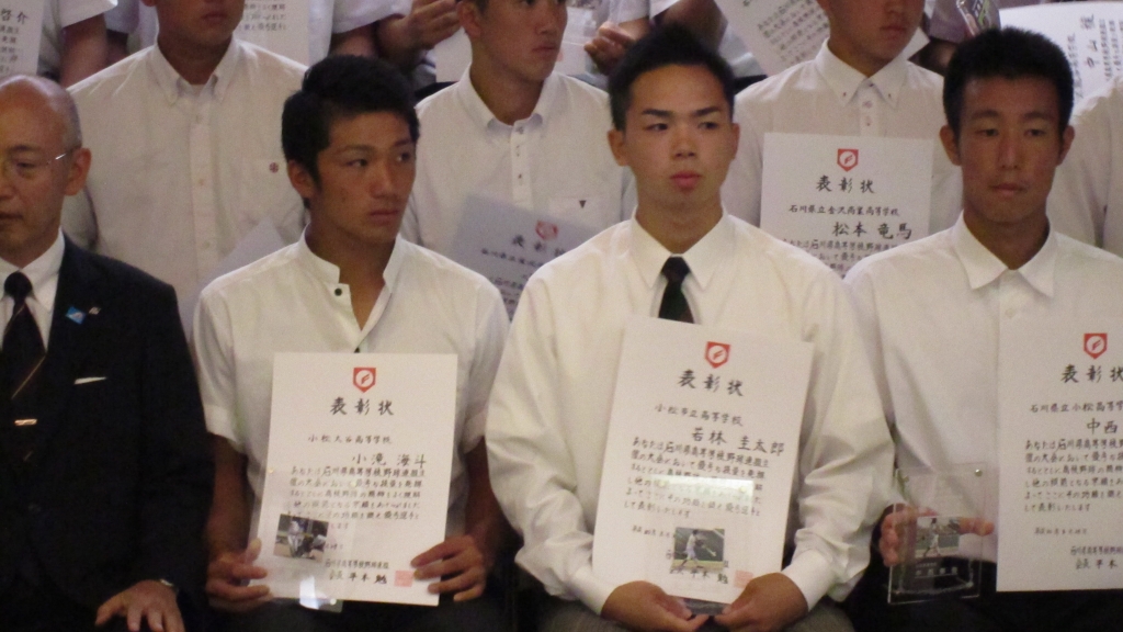 8月29日(水)に平成30年度石川県高等学校野球連盟優秀選手表彰式が金沢市で行われ、各校野球部3年生から29名が選ばれ、賞状と盾が贈呈されました。本校野球部主将の若林圭太郎君も受賞しました。