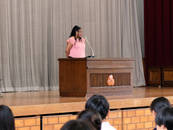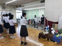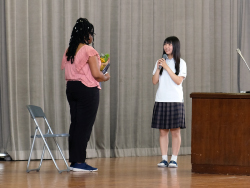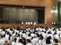 湿度が高く、朝から蒸し暑くなったこの日、1学期の終業式が執り行われました。式辞で久保出校長は、誰かのために頑張れる、行動できる人物になろうと語りました。また、今学期で任期を終えられるALTのマーシェル先生の離任式が続けて執り行われ、マーシェル先生は生徒たちに市高での思い出やメッセージを涙ながらに日本語で語り、お別れの挨拶としました。