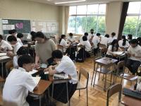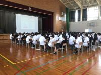 自らの進路について真剣に考えるこの時期に、進学志望の生徒は、県内外の大学、短大、専門学校のうち希望する3校の説明を聞きました。また、就職志望の生徒は、面接指導や志望理由書の書き方講座に参加しました。気温が高く暑い中でも、生徒はメモを取りながら熱心に耳を傾けていました。