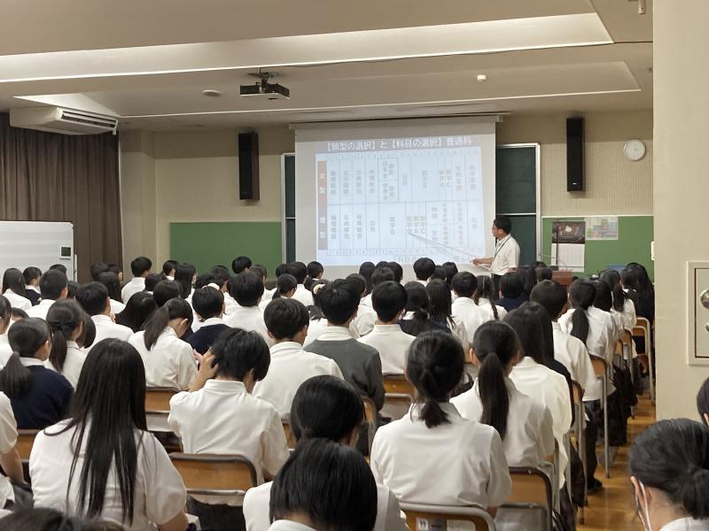 7月9日(火)ロングホームの時間で1年生に「類型科目選択説明会」を行いました。本校での文理選択や科目選択について、類型の違いや選ぶ際の考え方、科目選択の注意点等を説明しました。2年生、3年生での過ごし方や卒業後の進路、将来の社会生活にまで関わる話のため、スライドを見る眼差しもみな真剣でした。この類型科目選択を通して、教員と様々な相談をし、ご家庭でもいろいろと話し合い、一人ひとりが自分の進路や将来についてよく考えてくれることを期待しています。