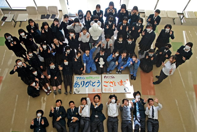1〜3年生の美術専攻生全員がロビーに集まり、1月の地震で壊れた石膏像の代わりをOBの方々が新しく購入し、寄贈していただいたので、お披露目会を開催しました。