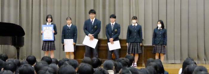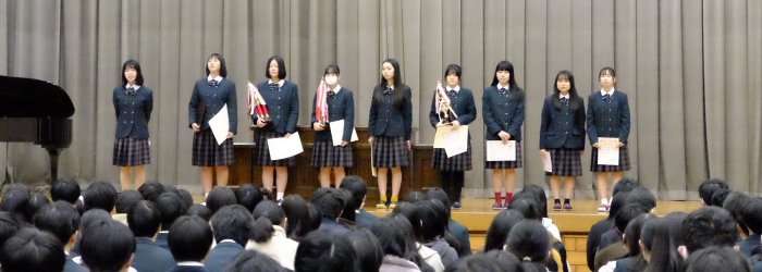 今シーズン本格的な雪となったこの日、2学期の表彰式・終業式が執り行われました。表彰式では今回もたくさん部活動、生徒が成績を残し表彰され、今後の抱負を述べました。終業式では源校長から今学期を振り返り、多くの生徒が部活やイベントで頑張り、活躍と成果を残してくれたと労いの言葉をかけ、年明けから本番を迎える3年生にはエールを送りました。
