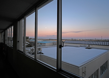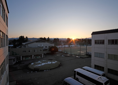 2023年の開校日も今日で最終日。今朝は大変天気が良く学校から満月と朝日を同時に拝むことができました。