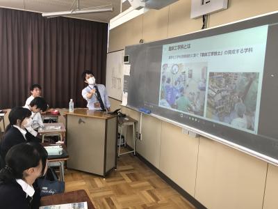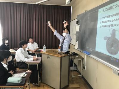 生徒は医療者でも実物を見たことがない方がいる「人工心臓」を手に取り、本物の人工ポンプが回転する様子を楽しんでいる様子でした。