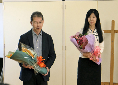 合評会前に、本美術専攻特別講師の西房浩二先生が先日「日展」で最高賞・内閣総理大臣賞、非常勤講師の古澤洋子先生が都知事賞を受賞したことに伴い、美術専攻からお祝いの花束を贈らせていただき、生徒達へメッセージを頂きました。