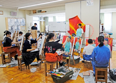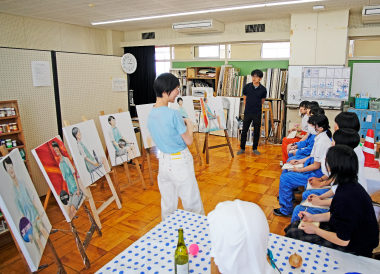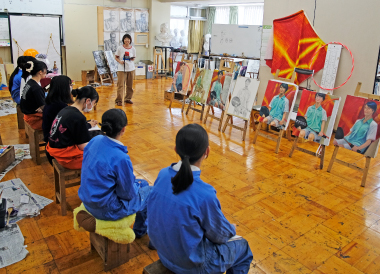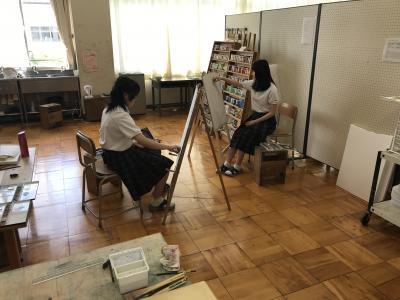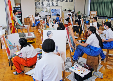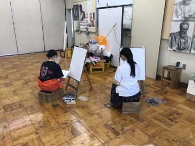 芸術コース美術専攻の夏の恒例行事「夏季強化週間」が21日から始まりました。22、23日の2日間は、油絵・日本画両専科合同で外部よりモデルを招き人物画の習作を描きました。制限時間内に仕上げるという緊張感の中、専科生たちは試行錯誤しながら真剣に作品と向き合いました。23日は、現在、金沢美術工芸大学に在学中の本コースOBが講師として訪れ、生徒たちと近い目線で助言と講評を行いました。