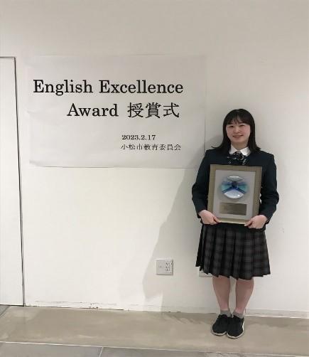 2月17日(金)、サイエンスヒルズこまつにおいて、令和4年度English Excellence Award(英語賞)の授賞式が行われ、本校3年山口ららさんが受賞しました。授賞式では、石黒小松市教育長の式辞のあと、山口さんが英語で謝辞を述べました。
