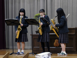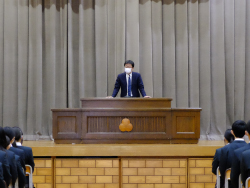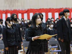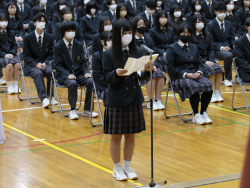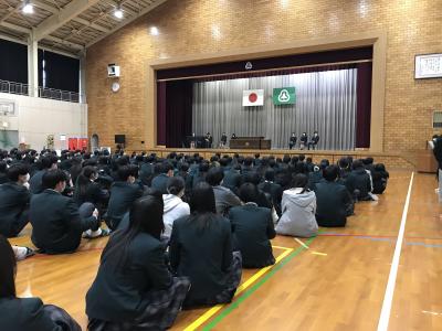 この日、今年度最後の行事となる表彰披露・終業式・離任式が執り行われました。終業式で学校長は「諦めないこと」と「目的を持つこと」について語り、新年度へ向け1,2年生を鼓舞しました。離任式では、この春で転勤、退職される教職員の方々から生徒たちへの最後のメッセージが送られました。
