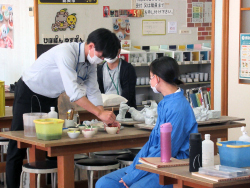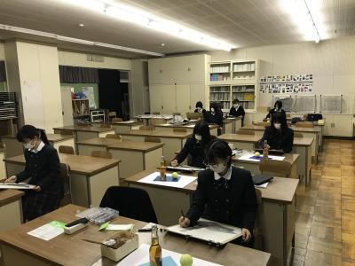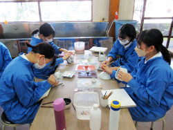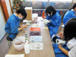 この日、午後から能美市の県立九谷焼技術研修所で美術専攻1年生の九谷焼実習が行われました。今回の実習は、7月に成形した作品に絵付けを行うもので、真っ白に焼き上げられた自分の作品へ、模様や彩色を施していきました。約3時間の制限時間の中、ギリギリまで作業を行い、こだわりの作品を制作しました。はてさて、仕上がりはいかに・・・。