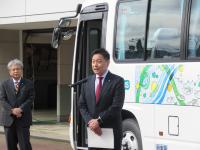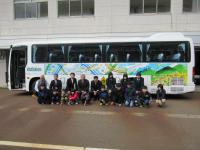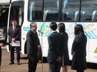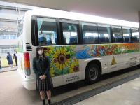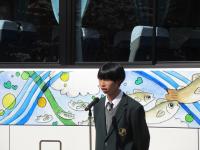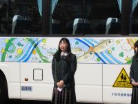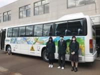 昨年秋に小松市から依頼を受け本校芸術コース生がデザインしたスクールバスが完成し、お披露目会が行われました。デザイン画が採用された3年北市さん、中村君、2年生黒地さん3名が出席し、市長、教育長、そしてバスを利用する松東みどり学園の児童生徒さんから感謝の言葉を頂きました。デザイン画制作にあたっては松東みどり学園で取材させていただいた時の印象や小松の自然をテーマ利用する人達が笑顔になるようなバスを目指してデザインしました。これから小松市内を走りますので是非ご覧下さい。