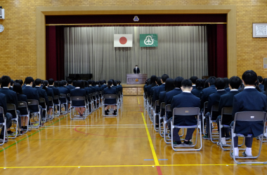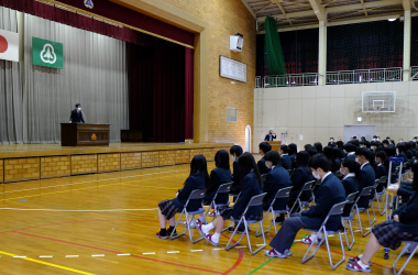 新年度スタートとなるこの日、午前に新2,3年生の始業式と今年度新しく赴任されてきた先生方の新任式が執り行われました。校長と教頭を含め、新しく教職員7名を迎えました。また、この春休み中ハンドボール部が全国高校選抜大会で準優勝に輝いたことの表彰披露も執り行われました。