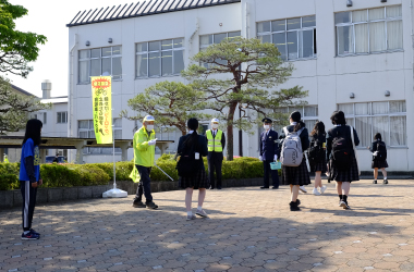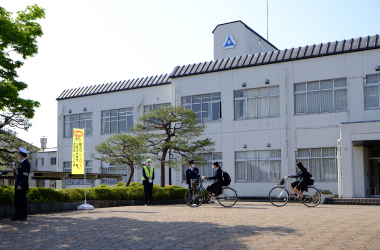 この日の朝、生徒の登校時に小松地域交通安全活動推進委員、小松警察署が中心となってサイクルマナーアップキャンペーンが本校校門前で行われました。このキャンペーンでは、自転車で登校する生徒に街頭指導するとともに、反射材とツーロックの推奨など自転車の防犯と安全利用を呼び掛けていました。