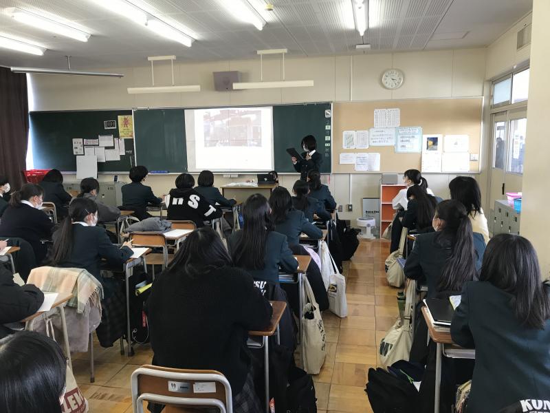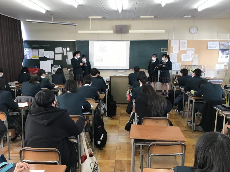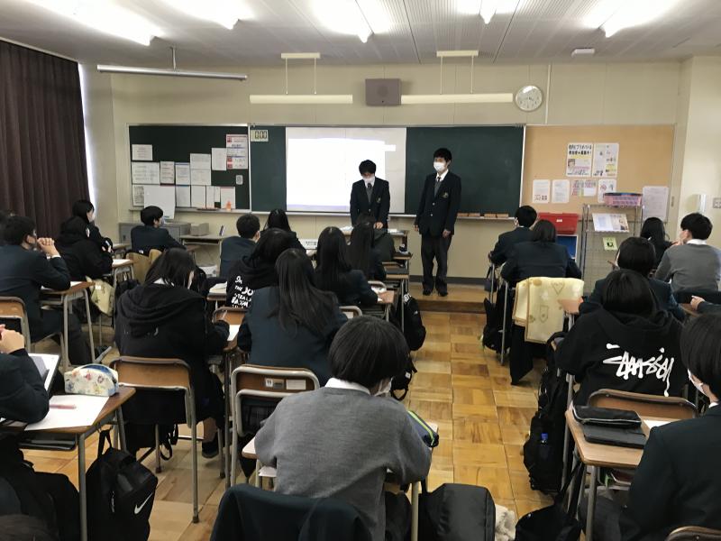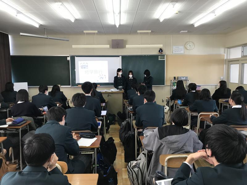 本日7限目の総合的な探究の時間に2年生が、後輩の1年生に向けて修学旅行のプレゼンを行いました。21Hの生徒は11H、22Hの生徒は12H、23Hの生徒は13H、24Hの生徒は14Hに出向き、パワーポイントを使い、単なる訪問先の紹介だけでなく、修学旅行をより充実させるためのアドバイス等、写真や動画を使い分かりやすく説明してくれました。発表した2年生は少し緊張した様子でしたが、後輩のために何とか伝えたいという気持ちが伝わってきました。1年生の皆さんの熱心にメモをとる様子も印象的でした。きっと修学旅行が一層楽しみになったことでしょう。