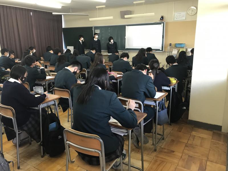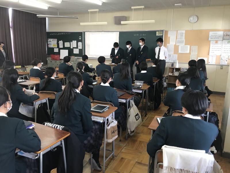 10日(水)に1年生各クラスで総合的な探究の時間の中間発表が行われました。生徒達は「商店街を若者の集まる場所へ」、「SNSを活用して若者に来てもらえるような店舗や写真スポットを作る」等、自分たちが設定した課題についてこれまでの取り組みを発表しました。生徒達は少し緊張した様子でしたが堂々と発表していました。発表後の質問に対しては少し戸惑う生徒もいましたが、これからの更なる探究に向けてヒントを得る良い機会となりました。これからアンケートや文献などで色々なデータを集め、分析し、その成果を2月に発表する予定です。