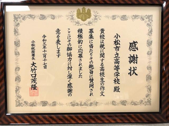 過日、小松税務署より本校の税に関する作文への取り組みに対して、感謝状をいただきました。当日は小松税務署副所長 鍜治望氏より、賞状を頂戴しました。本校では、税に関する作文は夏休みに1年生が取り組んでいます。
