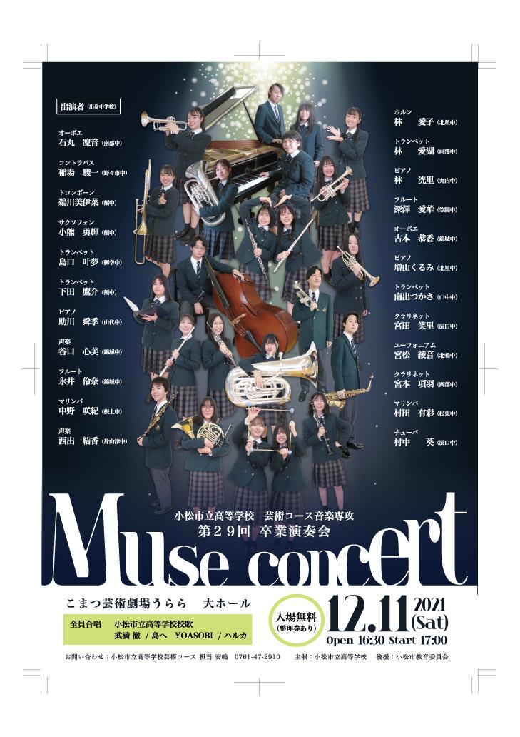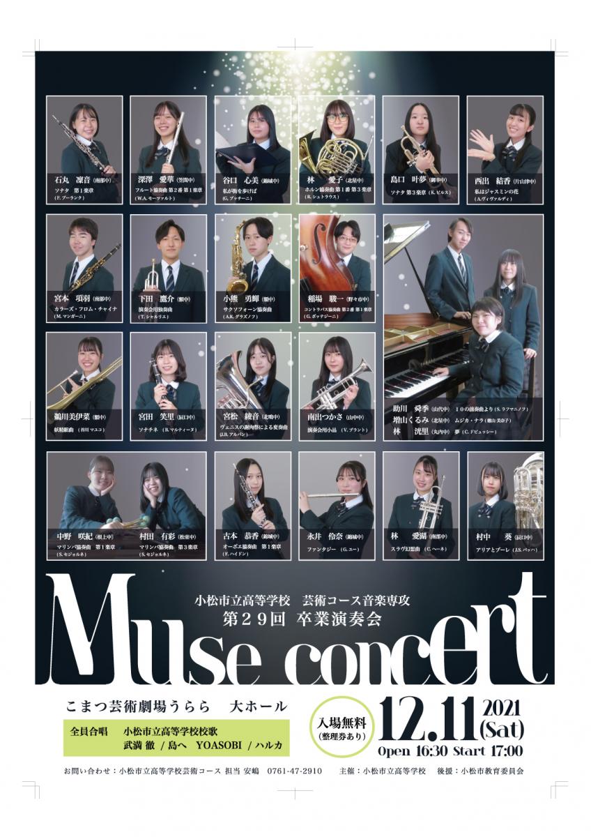 12月11日(土)こまつ芸術劇場うらら大ホールにて、芸術コース音楽専攻生による卒業演奏会「ミューズコンサート」が行われます。