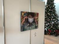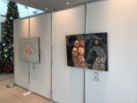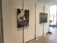 に高校総文祭美術展で入賞した松本さん、板狩さん、高校生の美術展で入賞した中村君の作品が展示されました。