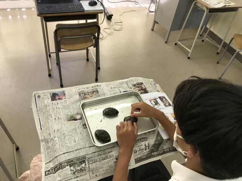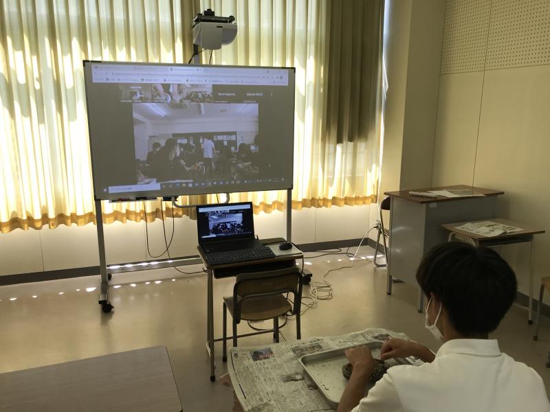 コロナ禍の影響で、残念ながら、オンライン開催となってしまいましたが、本来の対面による体験実習型セミナーで使用予定の教材「活アワビ」が、前日、本校に届きました。金沢泉丘高校、金沢桜丘高校、七尾高校、能登高校、本校の5校から18名の高校生が、金沢大学 理工学域 生命理工学類 海洋生物資源コース 竹内 裕 教授とZoomでつながり、午前は模擬講義「能登で学ぶ養殖アワビの世界 ~アワビの発生と成長の仕組み~」を受講しました。竹内教授の説明を聴きながら、実物のアワビを手にして、体のつくりを確認するなどしました。午後からは、能登海洋水産センターともつながり、研究室Webツアーで施設見学をしたり、亀井宏泰助教からご本人の研究を紹介していただいたりしました。