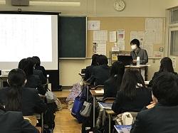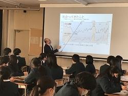 12/9(水) 高大連携クラスの国際教養講座が行われました。今回は公立小松大学生産システム科学部の香川博之教授に地球環境についてお話いただきました。香川先生は南極観測隊に参加されたことがあり、南極観測の歴史、地理、氷柱コアの掘削調査などについてお話くださいました。また、調査からわかってきたことの1つとして二酸化炭素濃度の増加があり、燃料問題への取り組み例として森林資源の活用などの最新情報を説明いただきました。未来を感じる学びの多い授業でした。生徒の感想から「二酸化炭素の削減について調べてみたい」「木からどうやってプラスチックを作るのか勉強してみたい」など関心の高まりがみられました。将来、地球環境にかかわる仕事につく生徒がでるかもしれませんね。