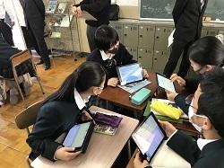 現代社会では、現在の日本において自由貿易・保護貿易のどちらを推進すべきか考え、タブレットを使ってグループで話し合いました。