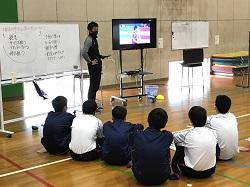 体育はバドミントンの授業で、色々なタイプのウォーミングアップの後、空いた場所を狙って打つことを狙いとしてミニゲームを行いました。自分たちのゲームの様子をビデオで確認して、ねらいを達成するためにどのような工夫をしたらよいか、意見を出し合いました。