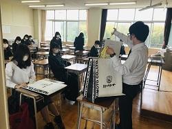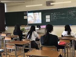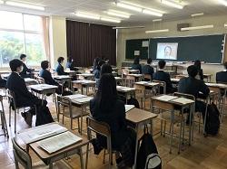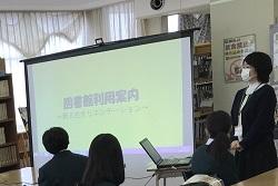 各教室で前後左右の距離を保って着席し、Zoomによる校長・総務課長・養護教諭の講話を聞きました。その後、校内見学や個人写真撮影、図書館の使い方など、学校生活再開に向けてのオリエンテーションを行いました。