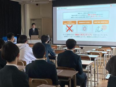 12月18日に、石川県赤十字血液センターの方や小松青雲ライオンズクラブの方々が来校され、献血セミナーを開催しました。サッカー部、野球部、JRC部の生徒が参加しました。