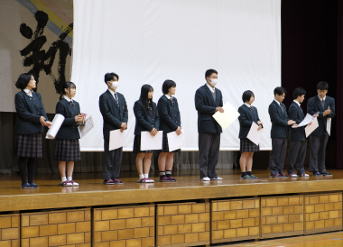 朝、雪がうっすら積もったこの日、2学期の表彰式・終業式が執り行われました。