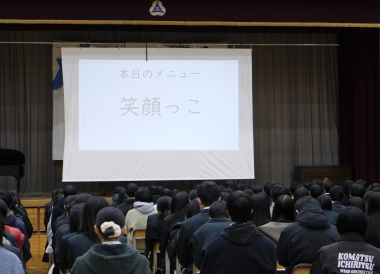 終業式では久保出校長が「笑顔」をテーマにゲームを交えて、笑うことについて話をしました。