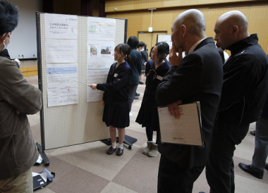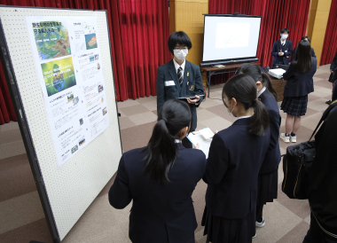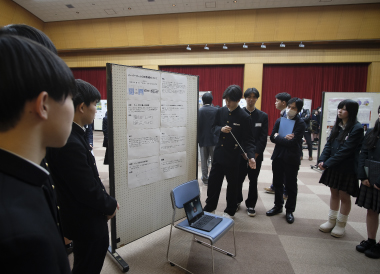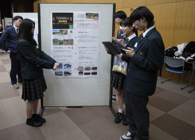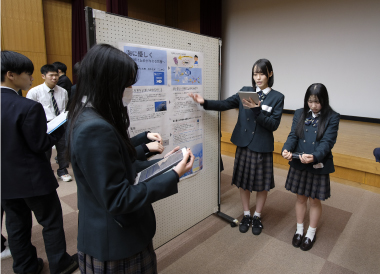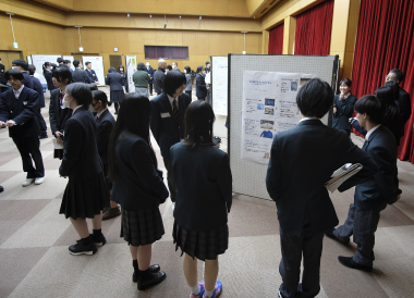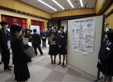 この日の午後、南加賀地区探究合同発表会が小松市民センターで行われました。これは、総合的探究の時間で生徒が自らテーマを設定し、仮説検証することで、その分野について深く学ぶ探究活動の報告会で、加賀地区内の小松、小松明峰、小松商業、大聖寺、鶴来、本校の6校25グループが参加、各グループがこれまで探究してきた内容と今後の課題を発表し合いました。生徒たちは、関心のあるテーマや探究内容のブースに赴き発表を熱心に聞いた後、学校の垣根を超え内容についてのディスカッションを積極的に行っていました。