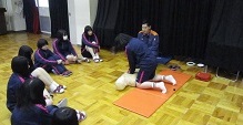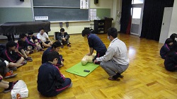 小松市消防本部から消防士の方々に来ていただき、一部の3年生を対象に救命講習を行いました。消防士の方々の心臓マッサージの実演のあと、グループに分かれて全員が心臓マッサージとAEDの練習を行いました。皆一生懸命取り組み、万が一に備えた練習ができました。