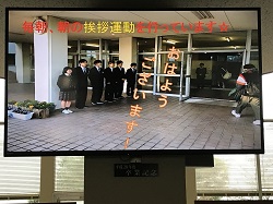 2020年2月4日 07時05分毎朝、挨拶運動で生徒玄関に立ち、がんばっている生徒会が、サイネージ(校内電子看板)で、挨拶や遅刻防止を広報しています。