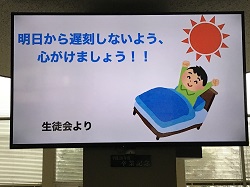 毎朝、挨拶運動で生徒玄関に立ち、がんばっている生徒会が、サイネージ(校内電子看板)で、挨拶や遅刻防止を広報しています。