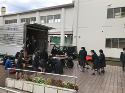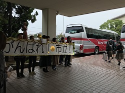 今朝、吹奏楽部が第67回全日本吹奏楽コンクールへと出発しました。楽器を積み終わり、玄関前に集合し、保護者の方へ「がんばってきます」と決意を伝えました。生徒達は「がんばれ!市立!」の横断幕の前を通って、胸を張ってバスへと乗り込みました。