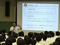 3年生対象に、令和2年度大学入試センター試験について説明をおこないました。志願票の書き方、出願時の留意点、受験に当たっての注意事項など確認しました。生徒達は真剣に聞き入っていました。いよいよ受験と感じてきたのか、放課後はいつもより質問にくる3年生が多かったようです。