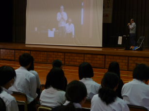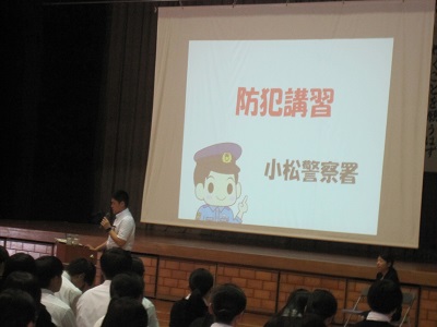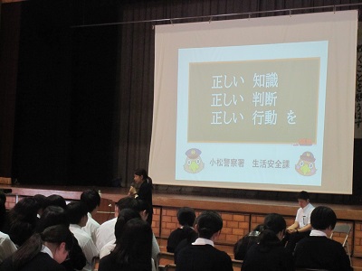 11日7限目、全校生徒を対象に小松警察署から2名の防犯担当をお招きし、実施されました。まず女性警察官から性被害にあわないために、身を守る思い切った行動(叫ぶ、逃げ込む)のしかたやスマホ・SNSの扱いについてお話がありました。インターネットの情報は時空を超えて果てしなく拡散することや、自力では絶対に消せないことなどを学びました。次に男性警察官から自転車の音楽等聞きながら運転は危険なので絶対やめること、またスマホの某サイトにアクセスするだけで、個人情報が盗み取られ、電話や葉書での「架空請求詐欺」にひっかかり、コンビニや電子マネーで現金を支払ってしまう事例が多発していることの注意がありました。生徒は真剣に聞き入っていました。