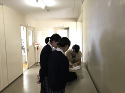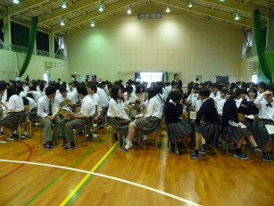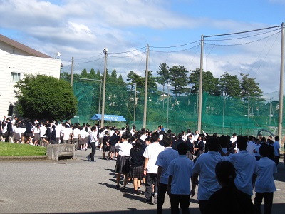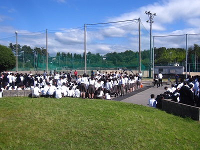 25日(火)7限目全学年を対象に地震を想定した避難訓練が行われました。生徒は整然と行動し、昨年と同じ時間で点呼を終えました。消防の方から、地震時には建物の高さの半分まで(4階建ての本校では壁から6~7メートルの所まで)割れたガラスが落ちてくるので特に注意することなどのお話がありました。