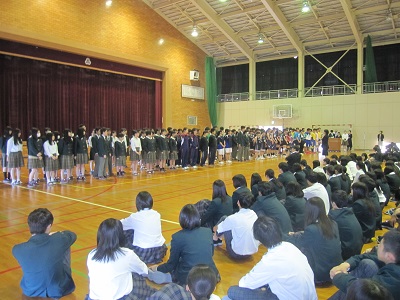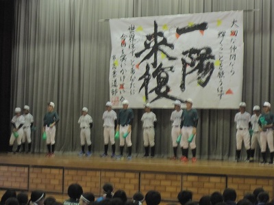 17日(金)中間テスト終了後、全生徒が体育館に集合し、総体・総文への出場選手等壮行会が行われました。運動部・文化部の順に入場後、整列した選手・代表に対し校長先生から激励の言葉がありました。続いて各部キャプテンから決意表明があり、会場から熱烈な拍手が送られました。選手・代表らは最後の戦いとなる3年生を中心に全力奮闘を心に決めていました。野球部の応援が最後を締めました。