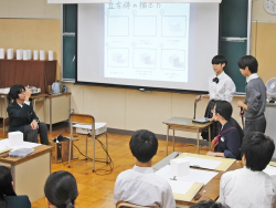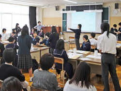 「芸術コースがあるところ」や「OSTの授業が好き」など、それぞれが考えた紹介文を発表しました。ALTや留学生からの質問にも、しっかりと答える様子が見られました。