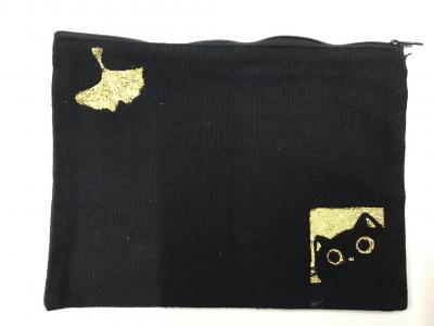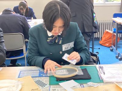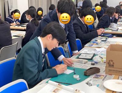 制作体験では金箔を使って黒のポーチに模様を描く内容で、カッターやマスキングテープを使って細かくデザインをしていました。制作中は、他校の生徒と話をしながら和やかな雰囲気で交流を楽しんでいました。